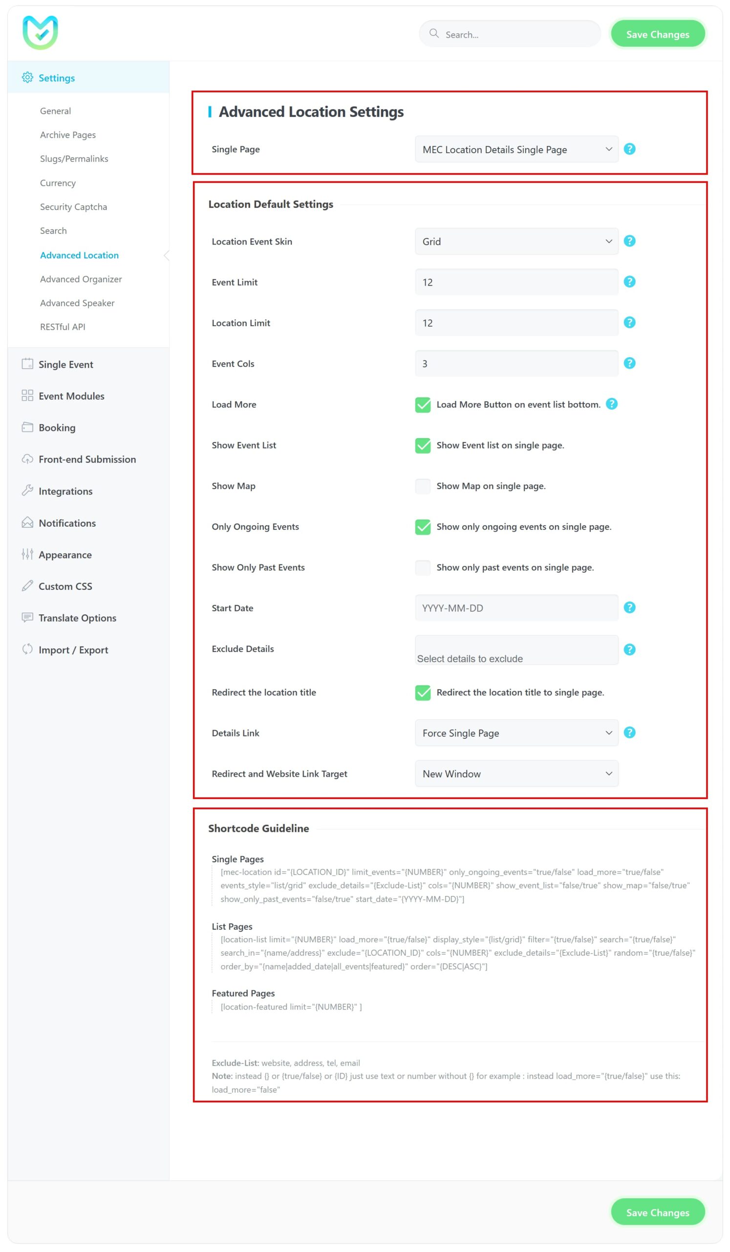 After installing the Advanced Location Addon, you will see a new menu in MEC’s settings.
