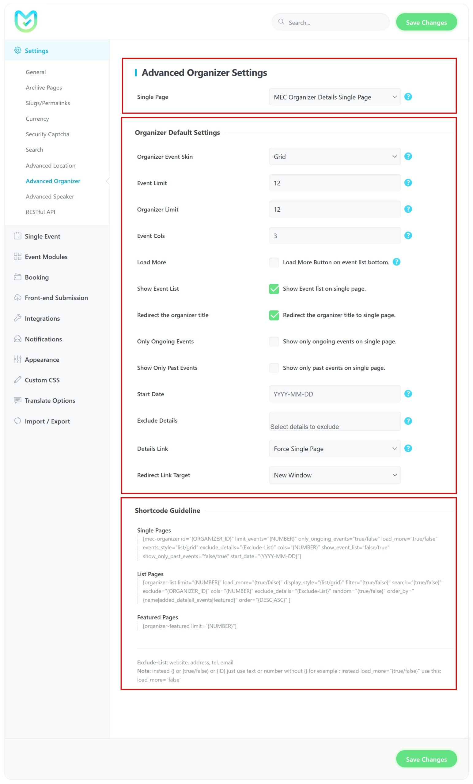 After installing the Advanced Organizer Addon, you will see a new menu in MEC’s settings. We will explain each section here: