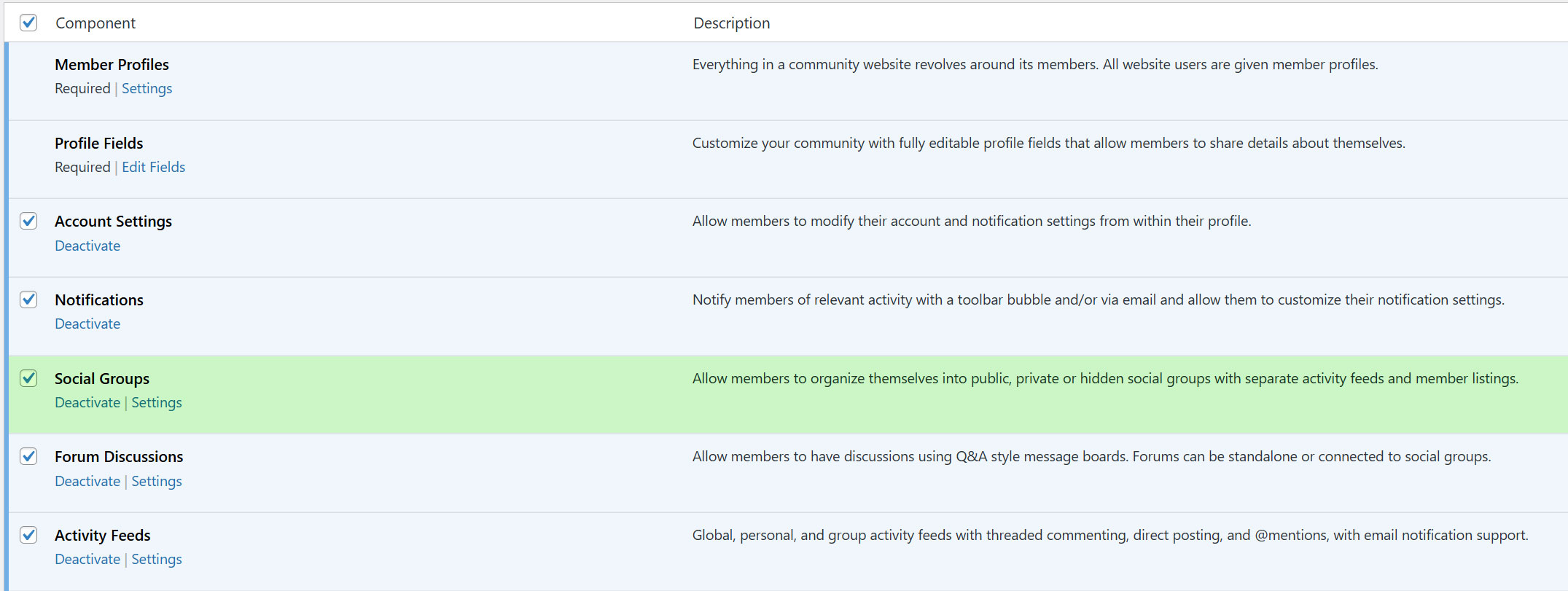 - Social Groups: Navigate to WP Dashboard > BuddyBoss > Components and ensure Social Groups is enabled.