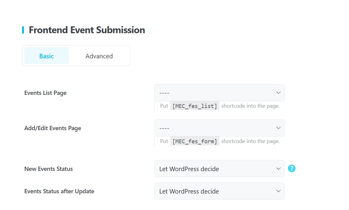 - Link Pages in MEC: Navigate to MEC > Front-end Submission > Basic and select your newly created pages in the dropdown menus for Events List Page and Add/Edit Events Page.