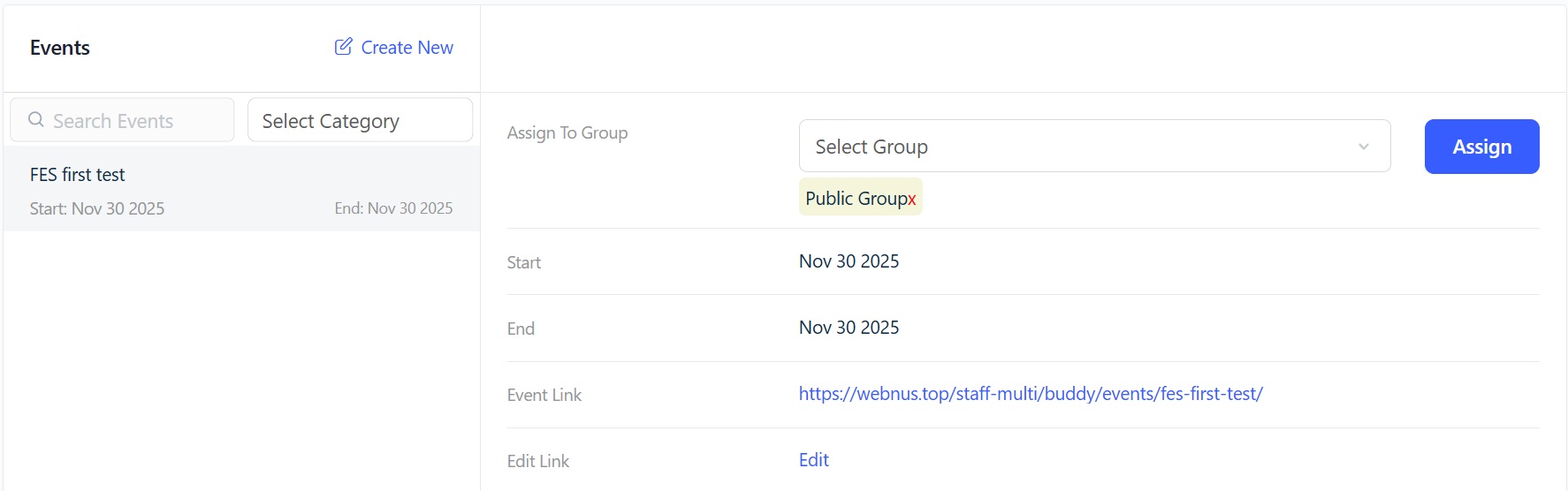 Pro Tip: In front-end, if you are inside a specific group and click the Create New button, that group will automatically be selected as the assigned group for the event you are trying to create.