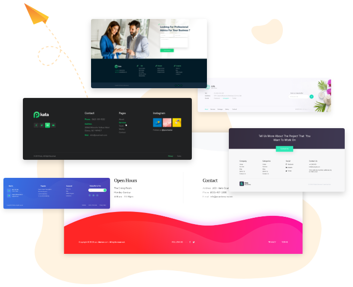 The Footer Builder of the Kata theme has also been developed based on Elementor. This way, you can use all the widgets and elements available in the theme and design your desired footer. Various footer designs have been prepared, and by importing them, you can speed up building your footer.