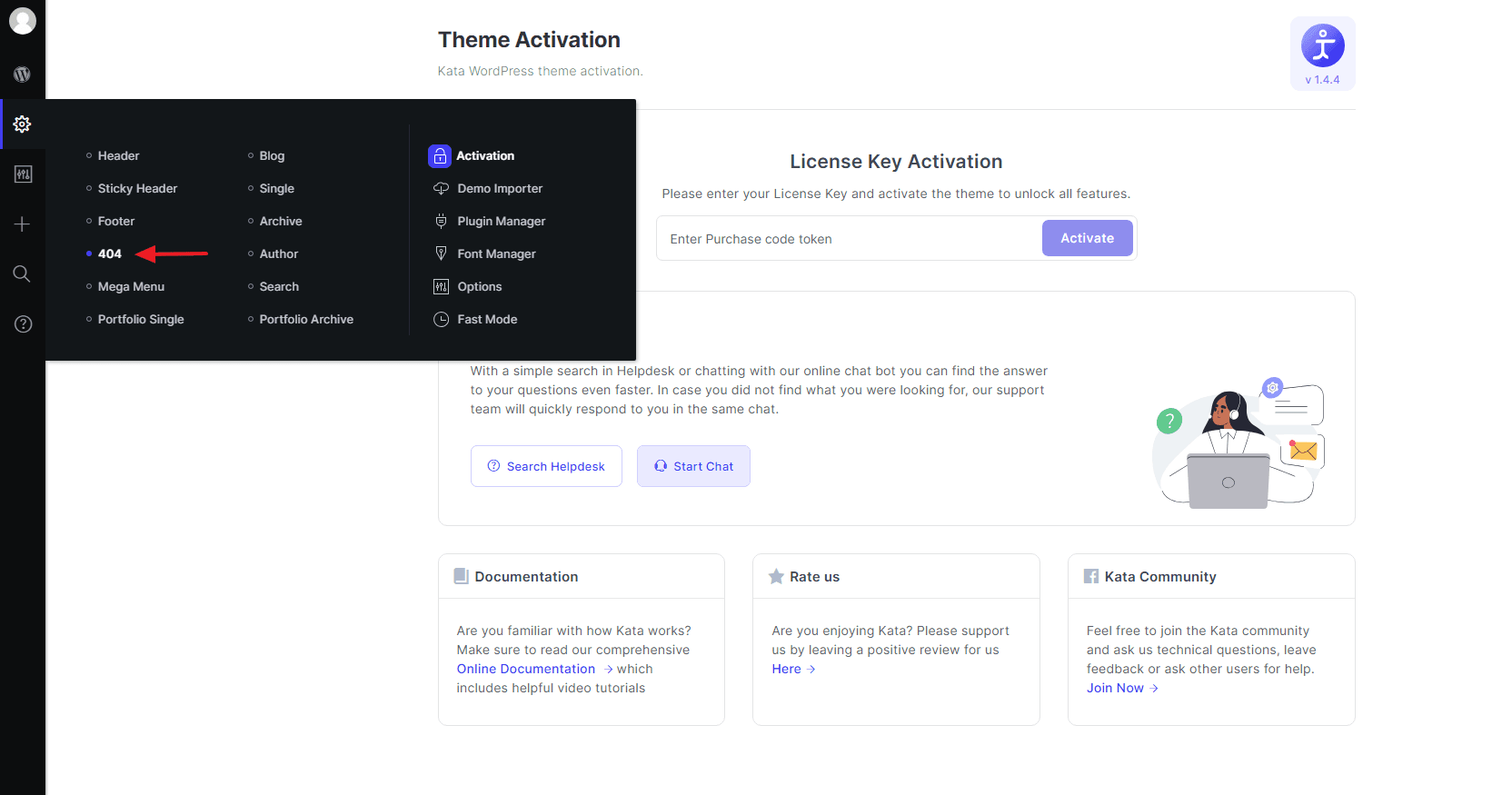 In the Kata Control Panel, find and click on the 404 options. This section is dedicated to customizing your 404 page.