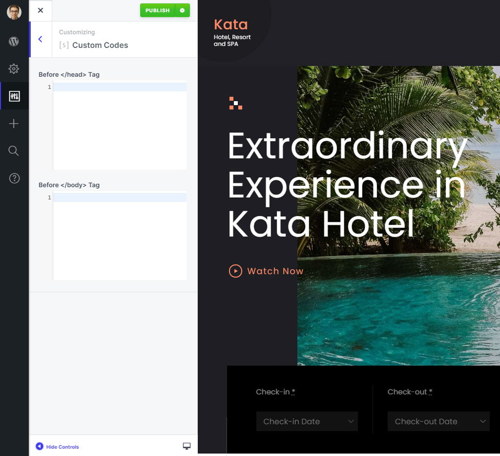 - And now copy and paste your Tracking ID to Options (Customizer) > Custom Codes > Before </head> tag