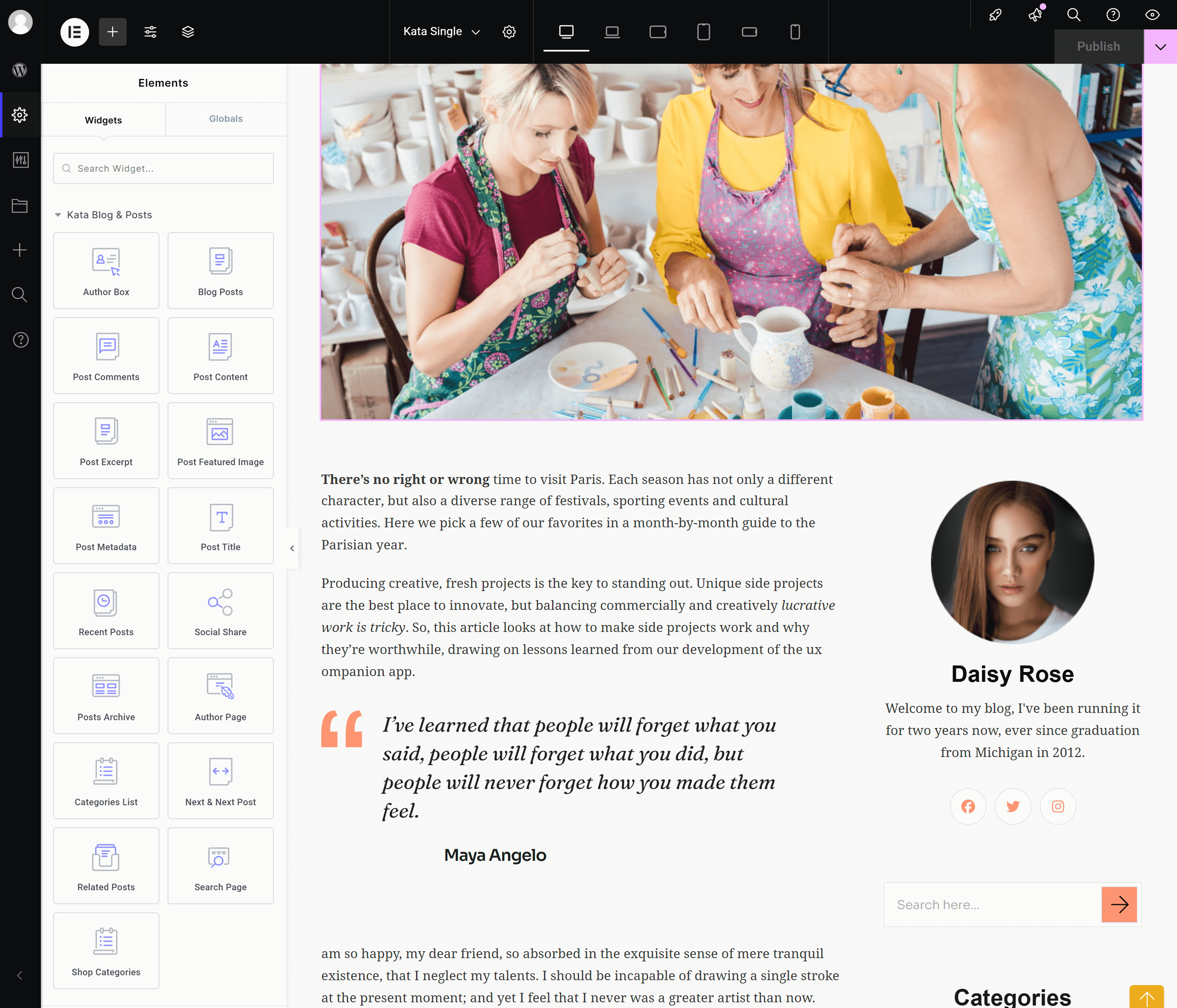 In Kata, all post details are integrated as Elementor elements, enabling you to use Elementor’s drag-and-drop functionality to personalize your single post layouts. You can arrange, resize, and style elements to create a design that suits your needs.