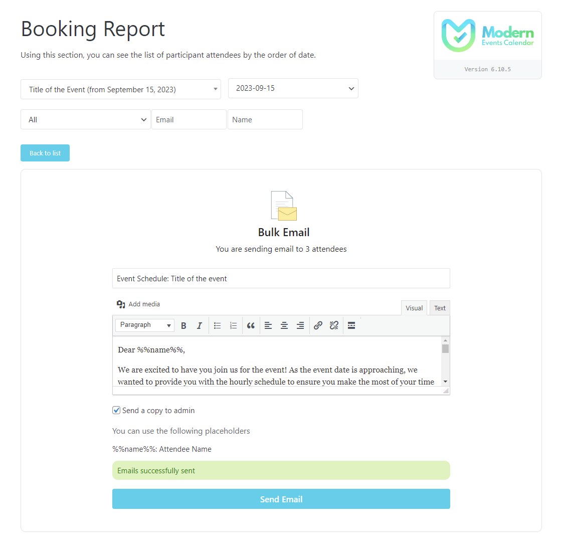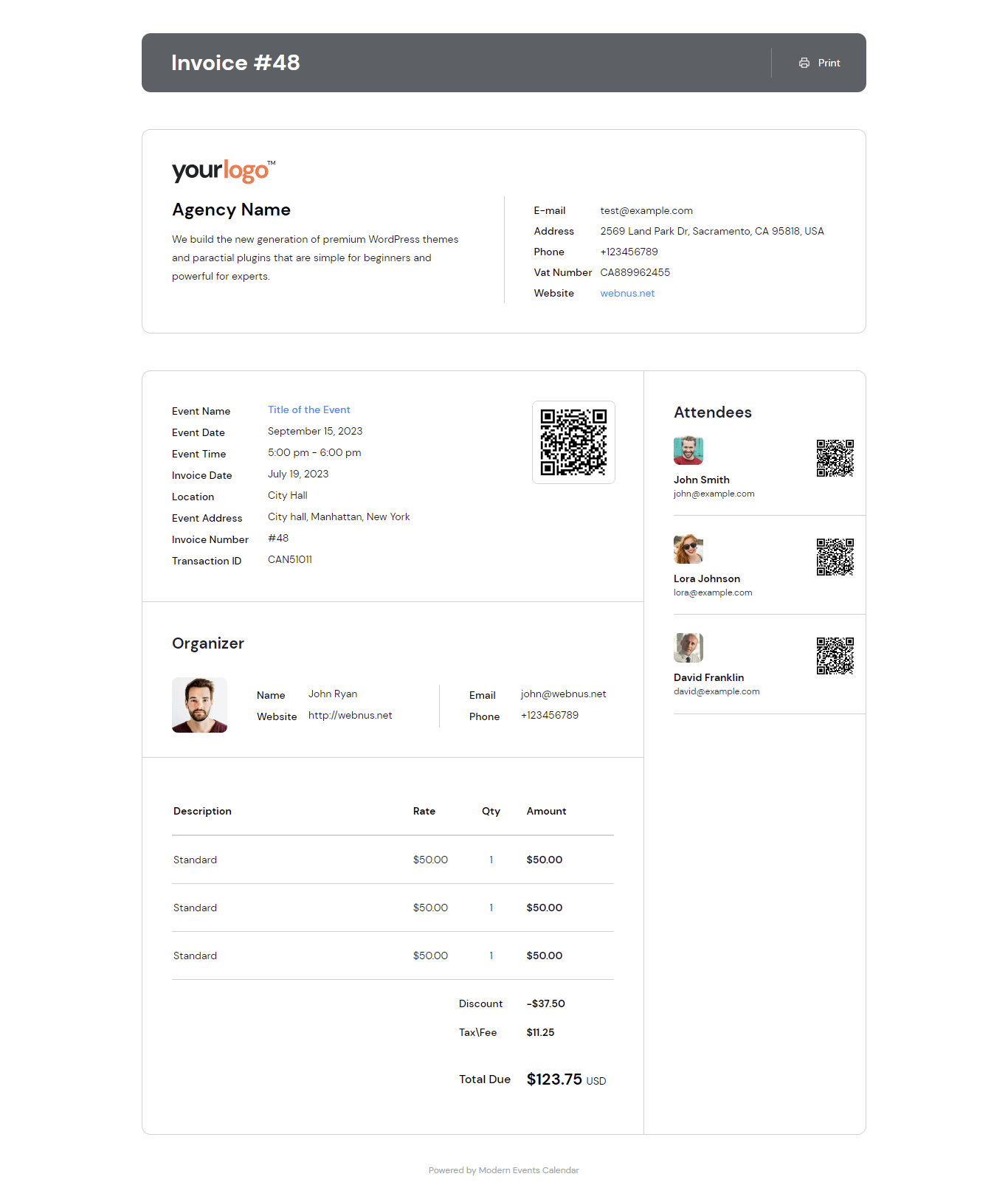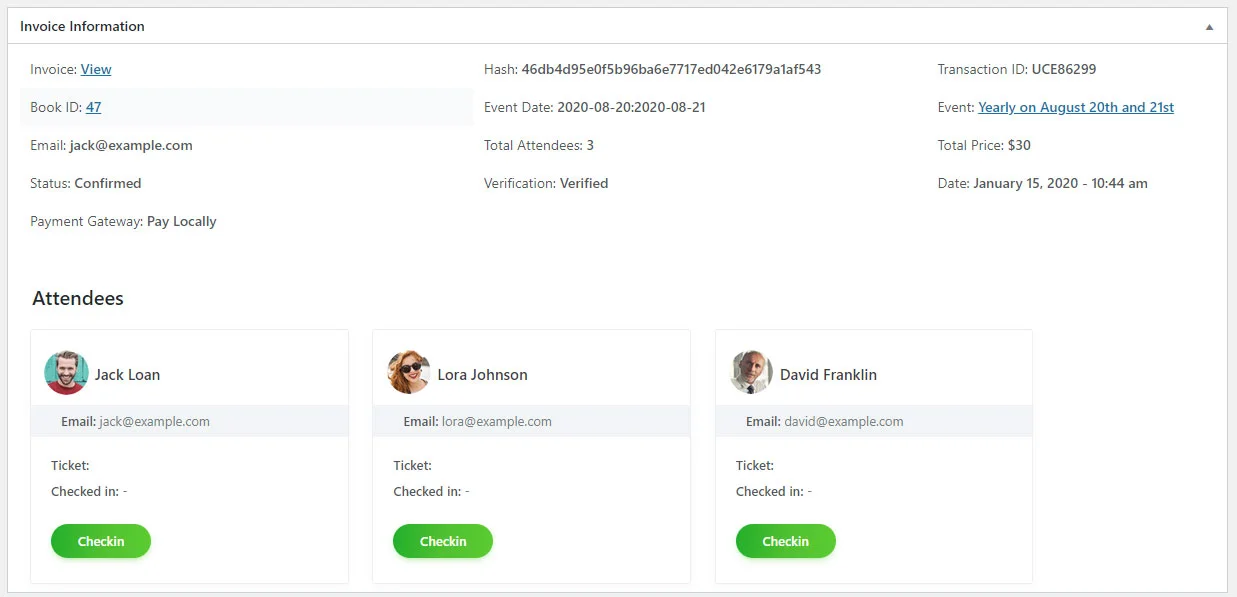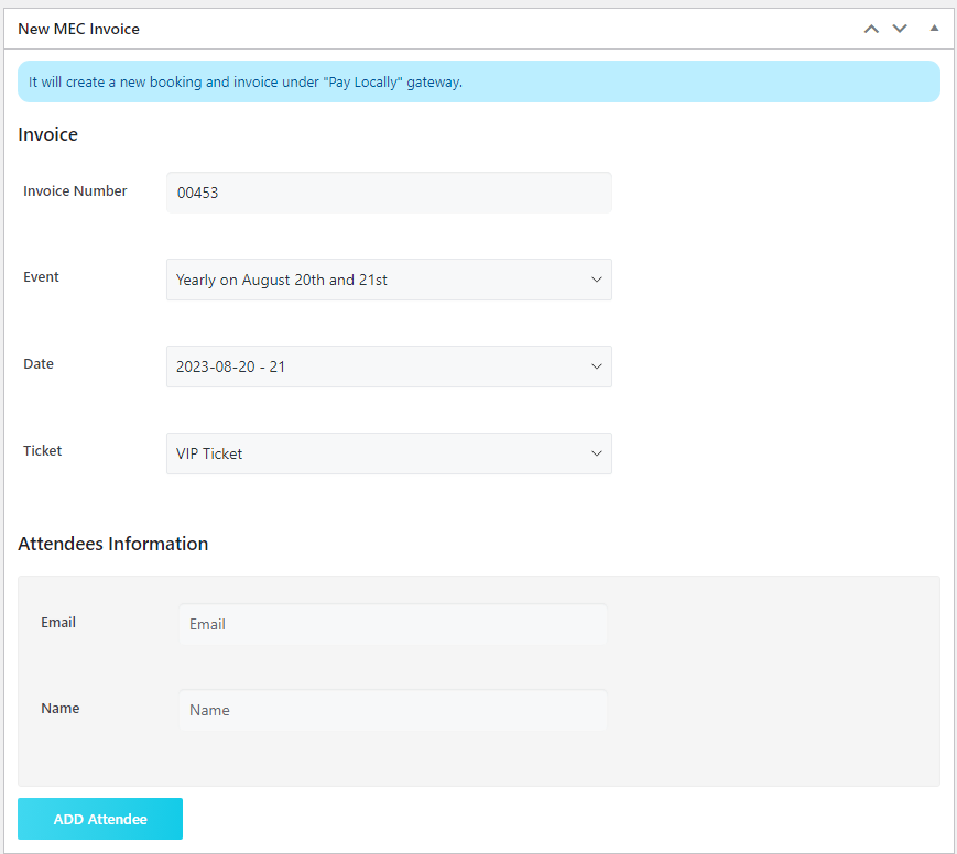 You can easily sell your events on your website using the Ticket & Invoice add-on. this add-on allows you to manage your attendees' check-in, send out tickets and invoices in email format.