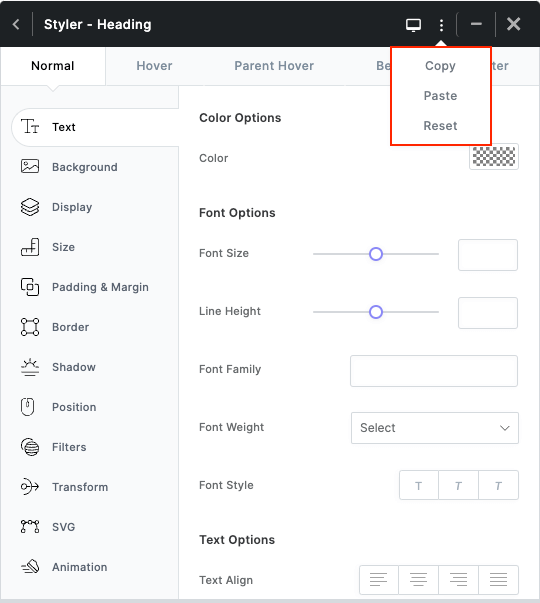 In the More menu, you can find the copy, paste, and reset options for the styles in the Styler.