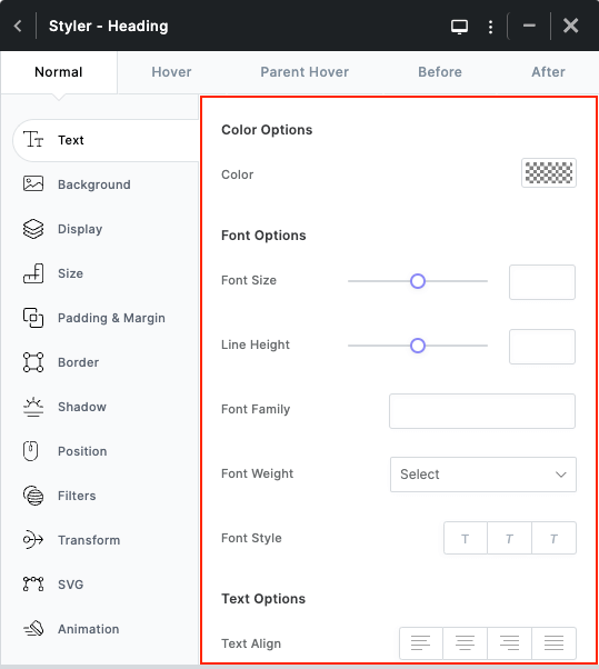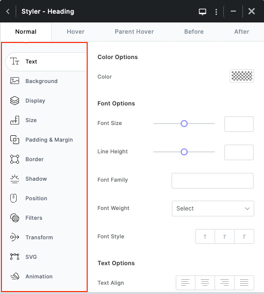 Similar properties are categorized on the left side of the Styler for ease of access. You can view the properties for each option on the right side.